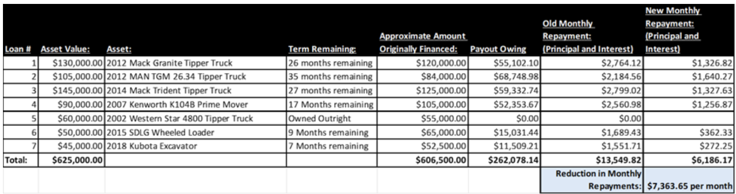 Below is a table showing the assets refinanced, along with a comparison of the old and new repayment amounts: